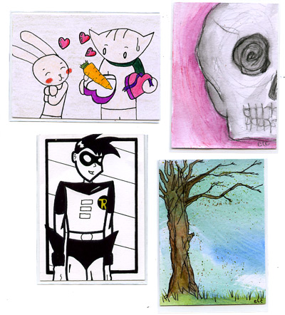 It’s not often that I scan and post images of the art cards I received. I really should. Here’s the most recent bunch that appeared in my lucky mail box.