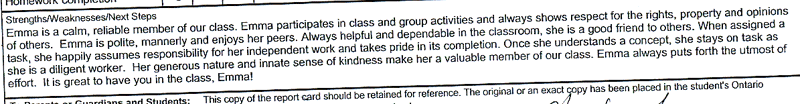 But there was really nothing to talk about because Emma came home with this on her report card (click to enlarge):